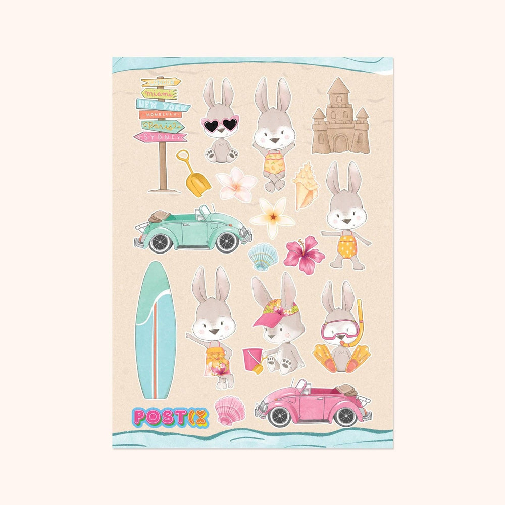 This Bondi Beach Bunnies Washi Sticker Sheet features 19 hand-drawn watercolour stickers of rabbits relaxing and playing in the sand or getting ready to surf the waves.