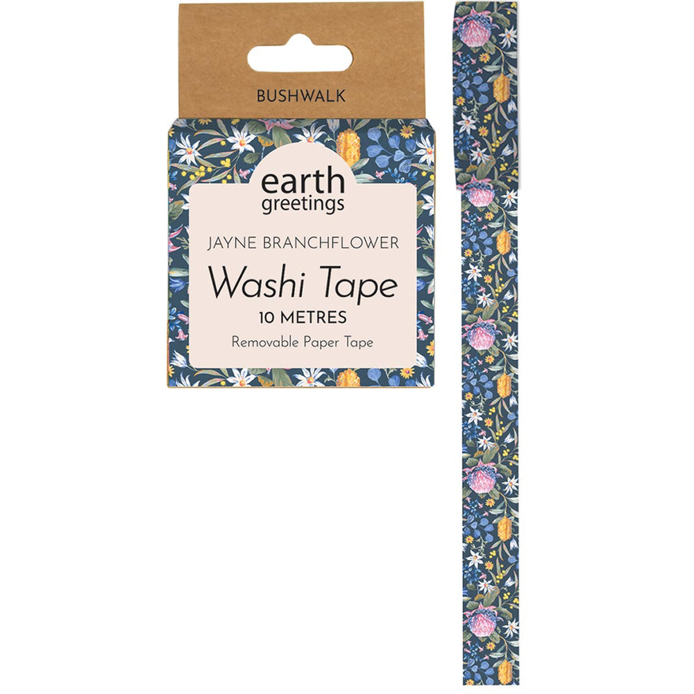 Earth Greetings Bushwalk Washi Tape is made from Japanese Washi paper with a 95% recycled paper core. It is a pretty paper tape featuring the botanical art of Australian artist Jayne Branchflower.