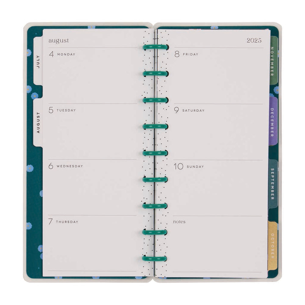 This Skinny Classic size planner features a horizontal layout with weekly spreads from July 2025 to June 2026 with lush florals and rich colours on the 12 dividers.