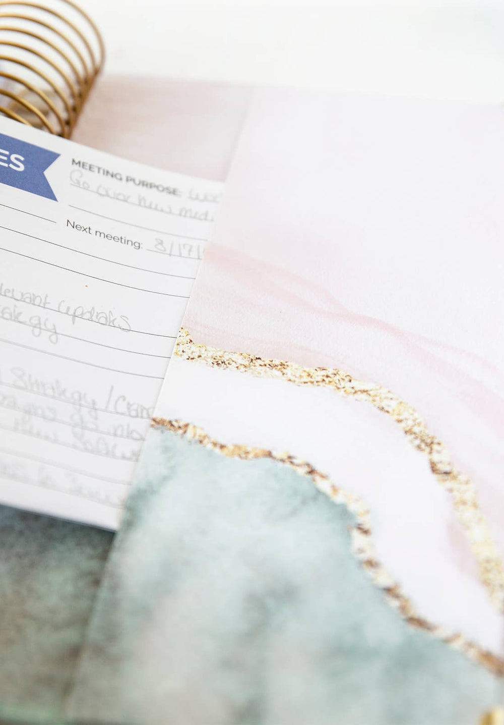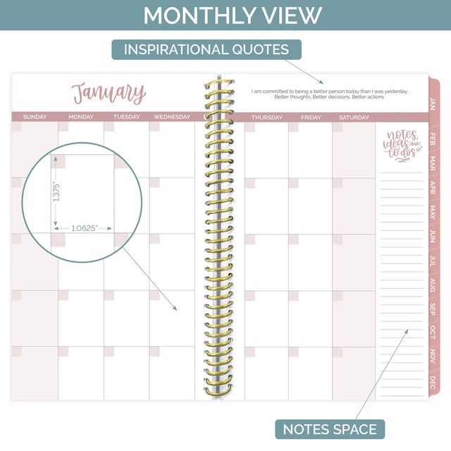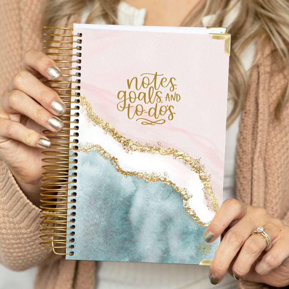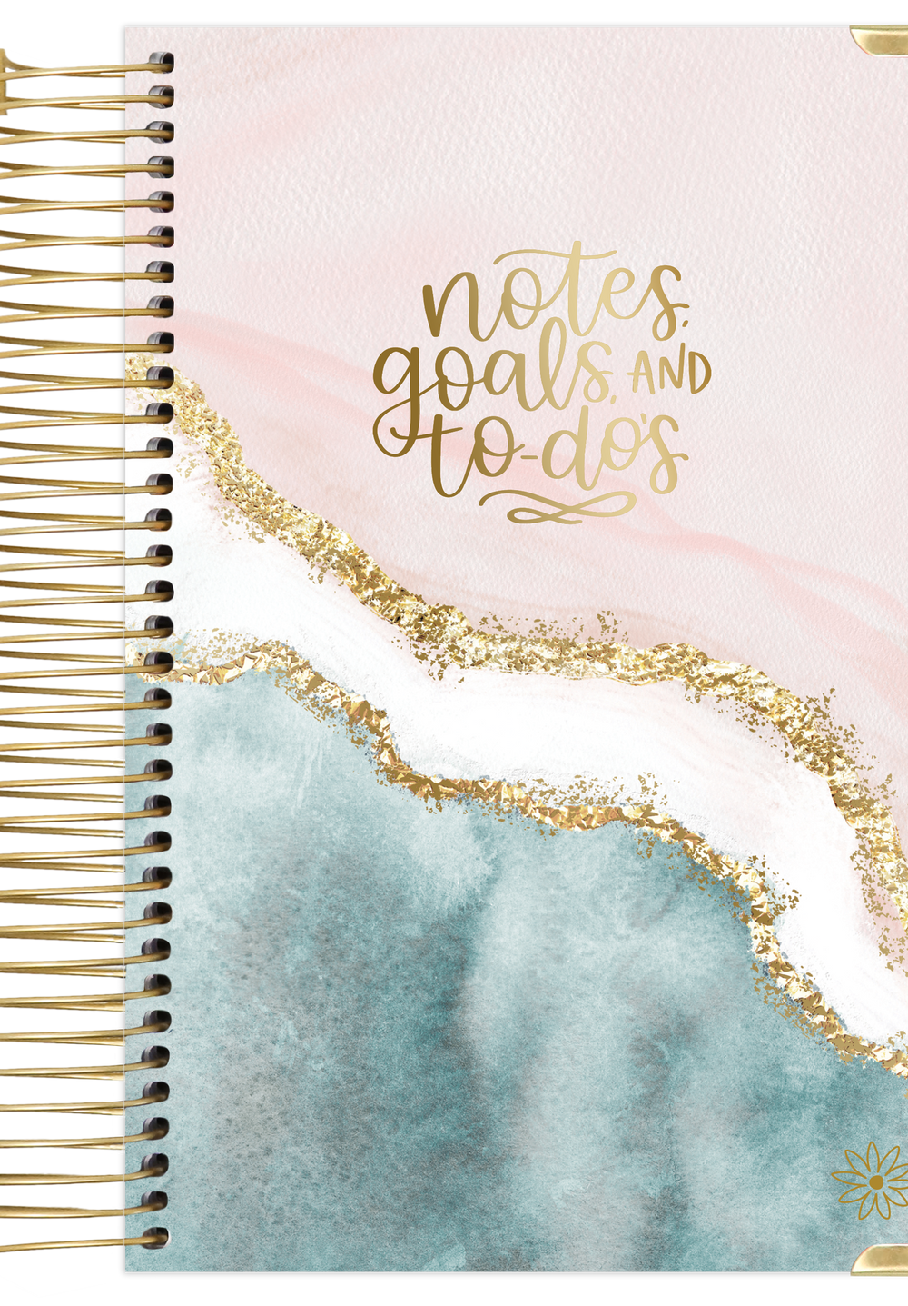 Notes & ideas - Supplemental pages include: Personal info page with mission statement prompt, goal setting page, vision board, monthly bill tracking, 3 notes pages, important dates for next year, how I bloomed this year page.