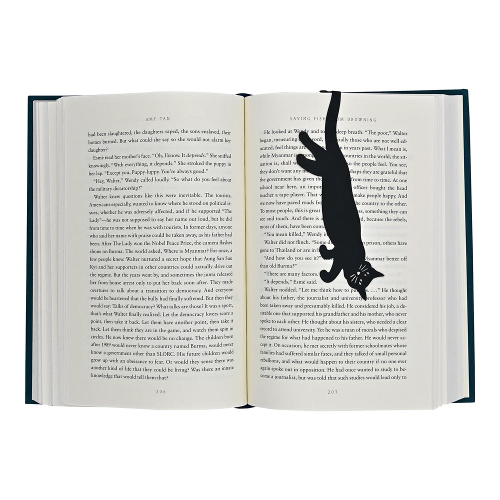 Mark your page in style with our Curious Cat Hanging Metal Bookmark! This custom-tooled, black metal bookmark has a fun, quirky design featuring a cat using its tail to mark your place - purr-fect for every book-loving cat person! Get yours today and add a unique, cool accessory to your book collection.