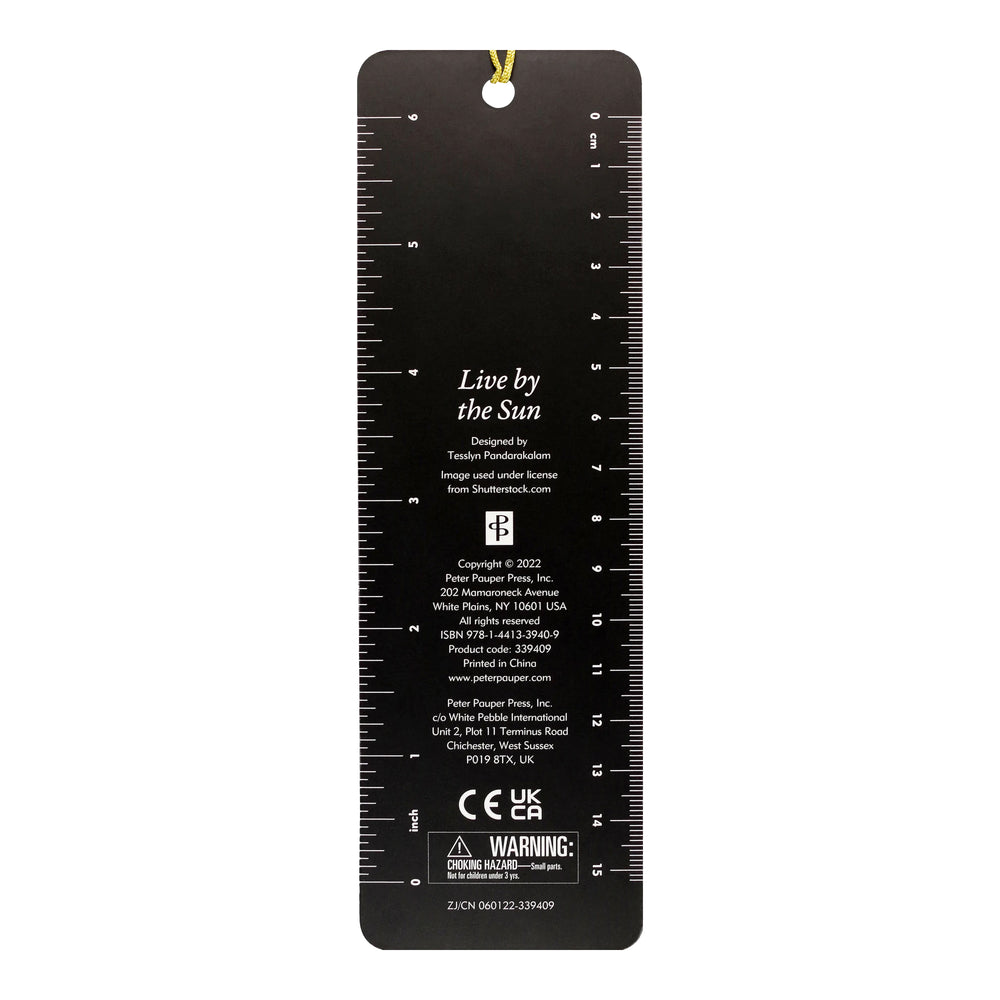 Shine on every page with this magical Live Sun Love Moon Beaded bookmark! Featured with a gold-foiled sun and moon design, this bookmark also comes with a silky tassel with the message "Live by the Sun, Love by the Moon." A handy ruler – measuring in both inches and centimetres – on the back.