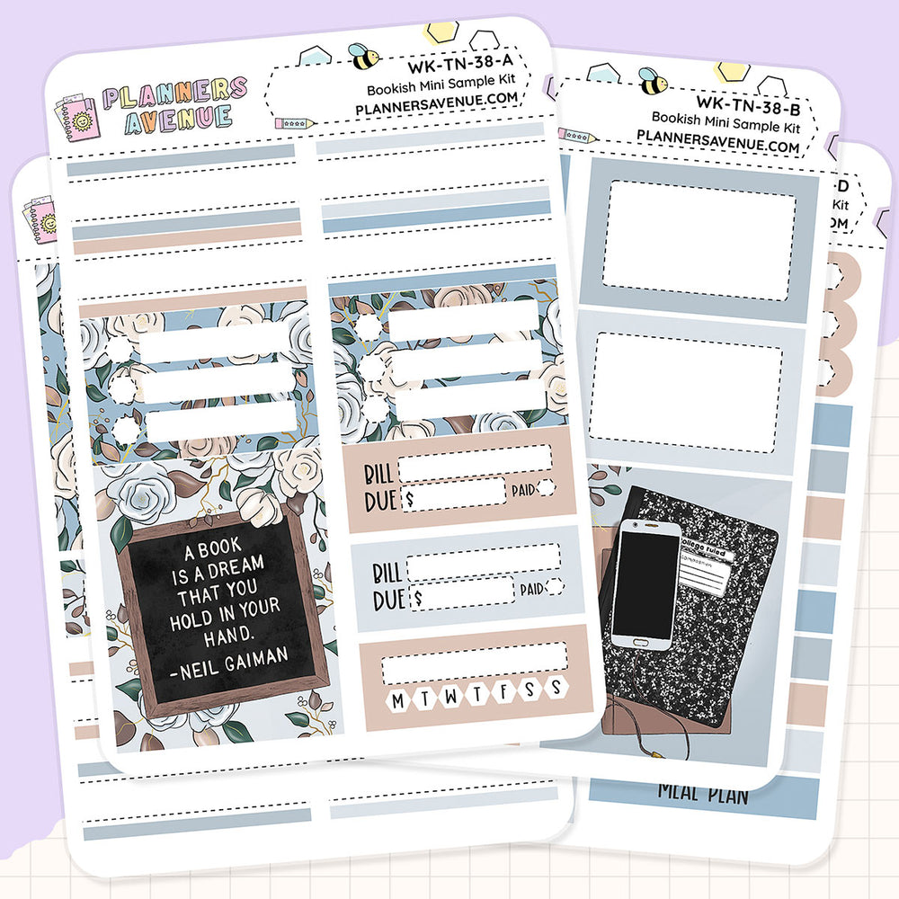 The Bookish Mini Sampler Weekly Sticker Foil Kit includes four small sticker sheets of planner stickers perfect for functional and decorative weekly planning.