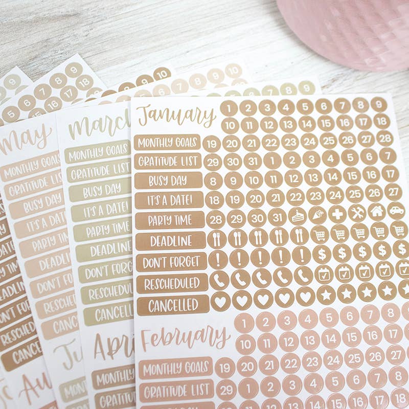 - Each month features 1 large and 5 smaller monthly headings, two sets of daily numbers for dating your planner's monthly and weekly views, various colour coordinated headings, and .32" dot icon stickers