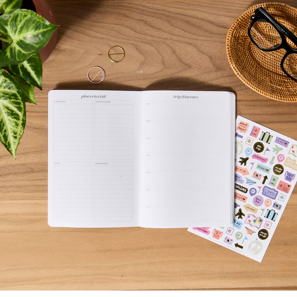 Track up to four weeks of stylish travel with daily spreads to log activities, meals, memories, spending, and more.