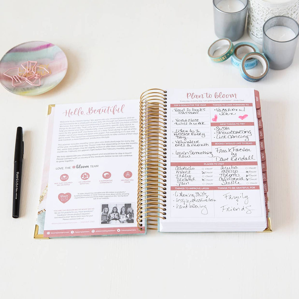 Notes & ideas - Supplemental pages include: Personal info page with mission statement prompt, goal setting page, vision board, monthly bill tracking, 3 notes pages, important dates for next year, how I bloomed this year page.
