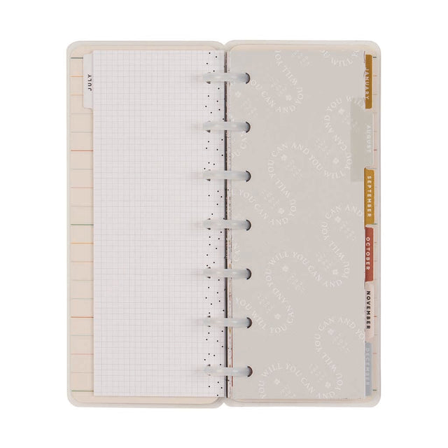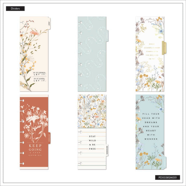 This small planner includes dated monthly calendars and weekly spreads. The 12 dividers detail dainty florals and inspirational quotes.