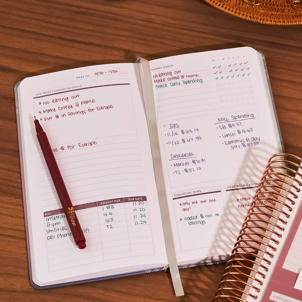 Erin Condren Hardbound Weekly Budget Notebook with weekly spread over two pages for budget goals, money habits and tracking bills.