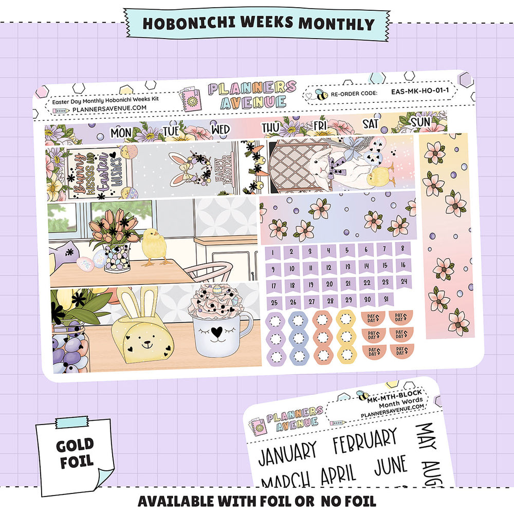 Easter Day Hobonichi Monthly Sticker Foiled Kit is designed for decorating the monthly view in your Hobonichi Weeks planner or other similar planner sizes such as Lime weeks and Mini Mallow planner.