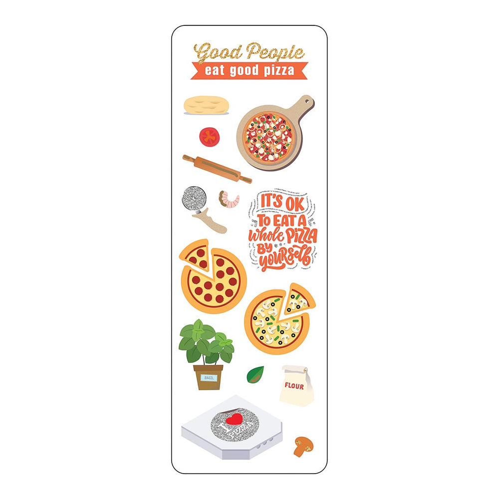 Say cheese Pizza Party Sticker Set including mushrooms, tomatoes, peppers, dough, and phrases like ''Good People Eat Good Pizza,'' ''Let's Eat,'' and more