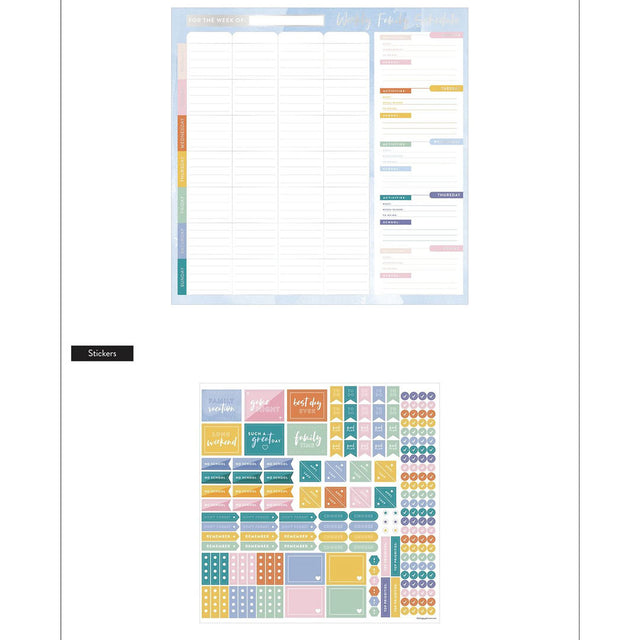 Features an undated weekly spread with plenty of space to write activities for the whole family. The margin has blocked spaces for daily activities and school schedules. Sticker sheet with 212 stickers to label important events, reminders, and chores.