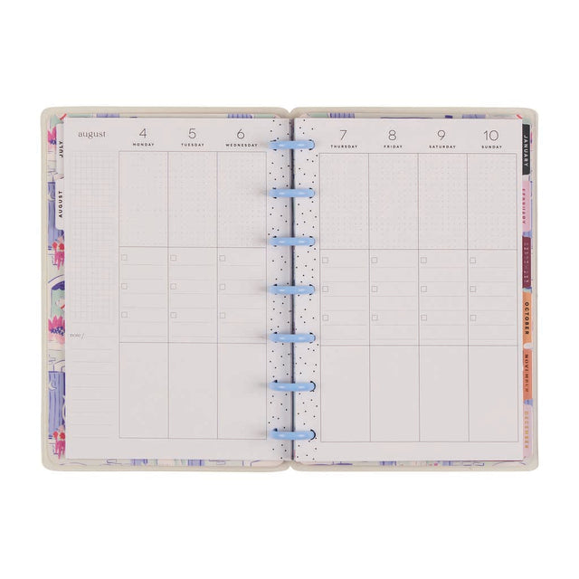 This mini happy planner includes dated monthly calendars and weekly spreads. The 12 dividers detail cute seasonal cat designs by guest artist Krissy Mast.