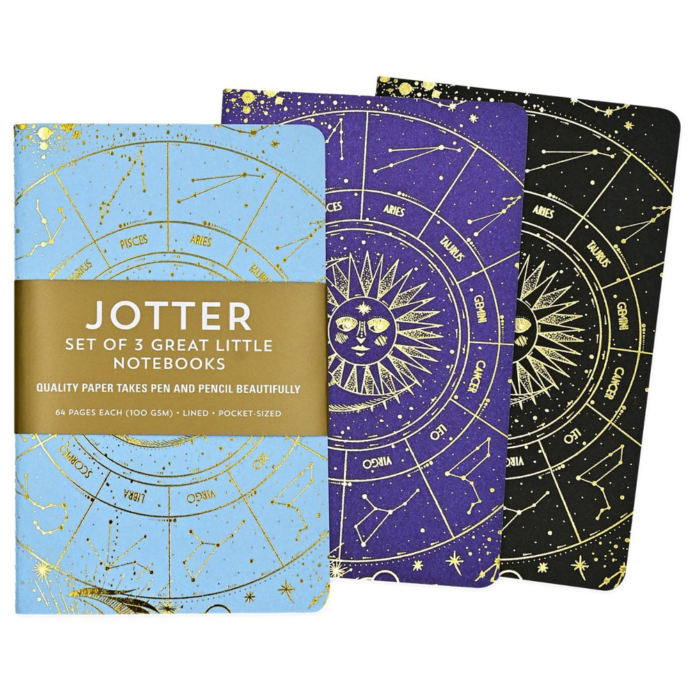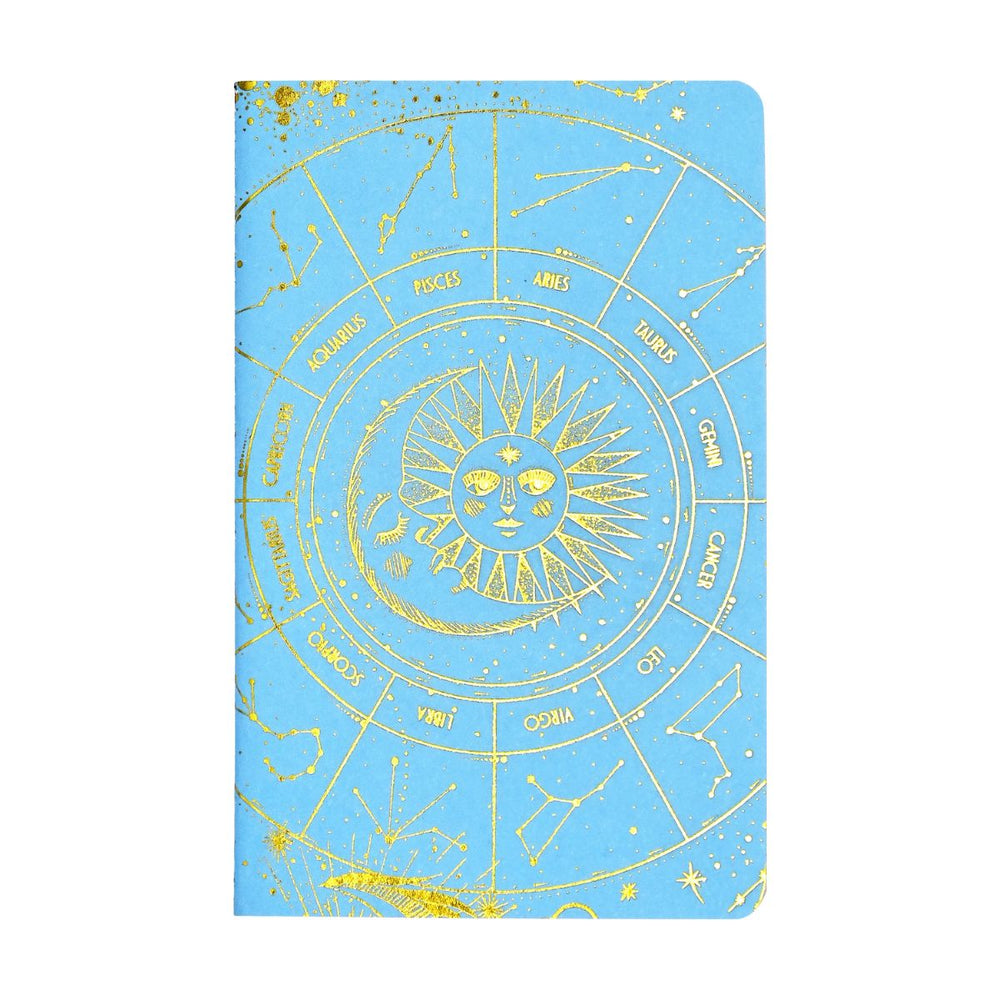 Each notebook features a celestial theme, with the sun and moon surrounded by the constellations of the zodiac.