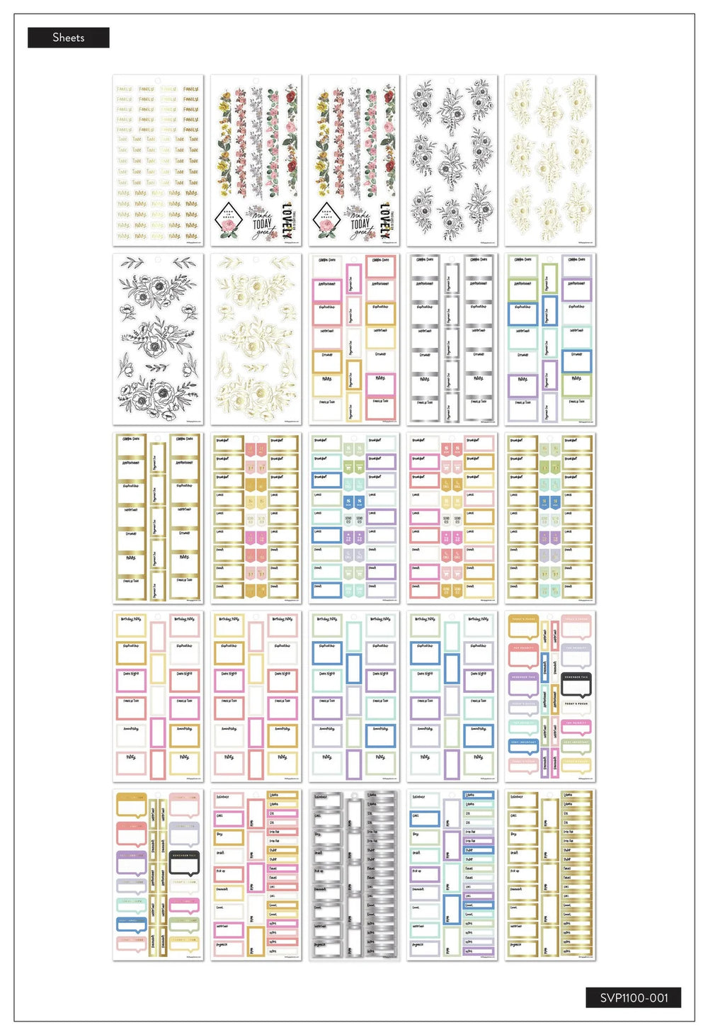 • A mixture of graphic designs, colorful boxes, monthly label stickers, reminders, and note stickers with metallic foil stickers throughout. Decorate your Happy Planner with inspirational quotes.