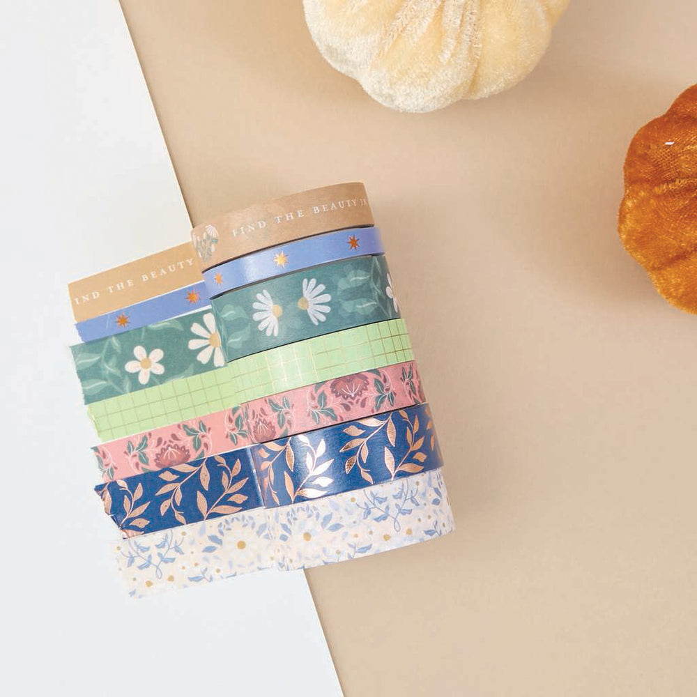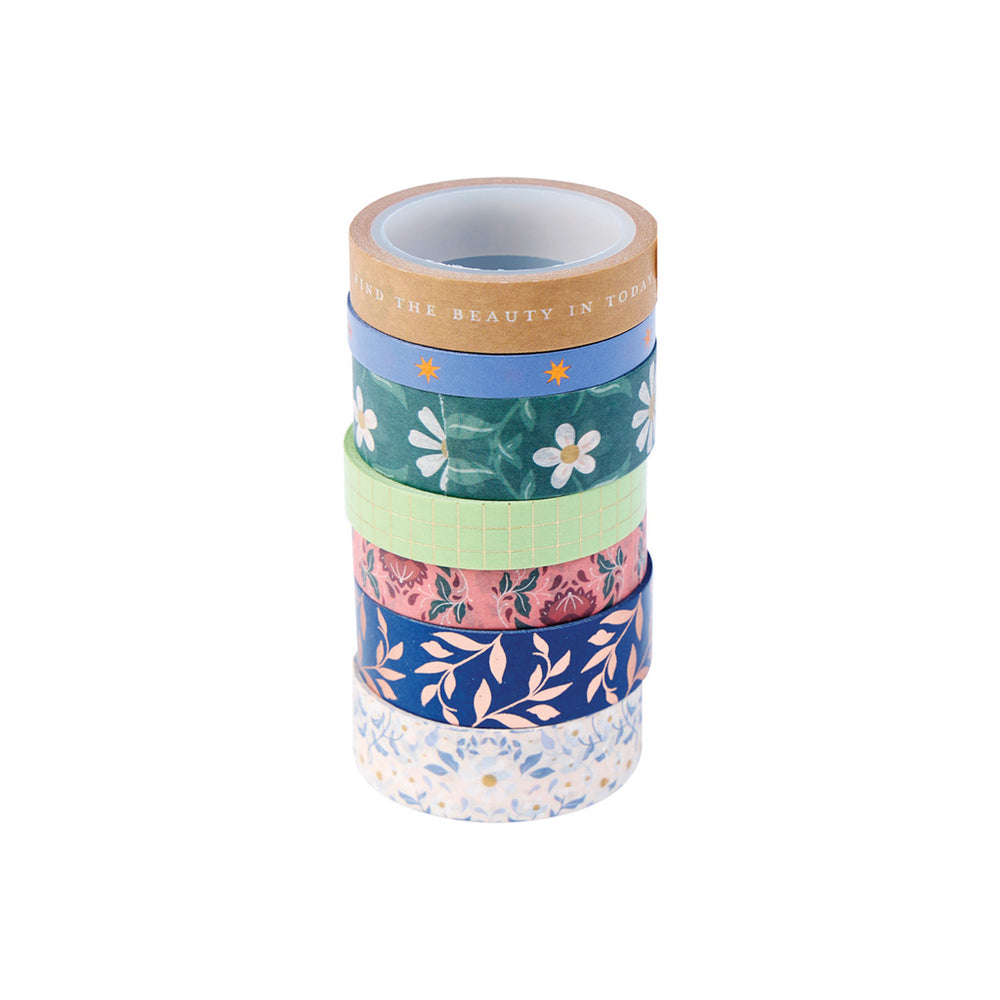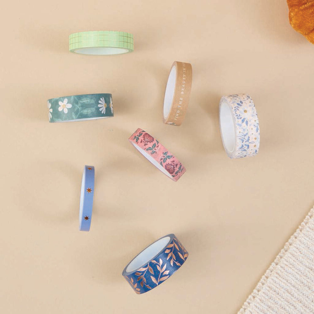 - 7 rolls of washi tape featuring floral patterns, positive messages, stars and gold foiled checkers