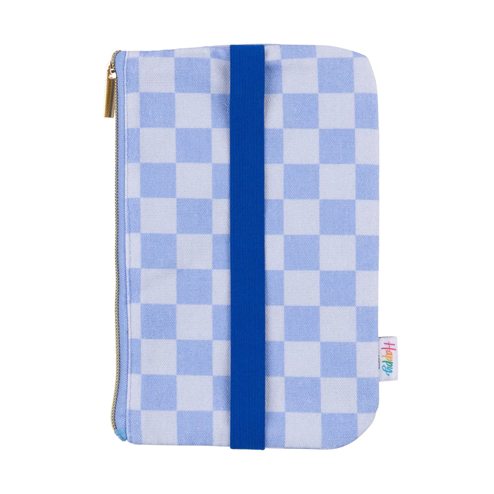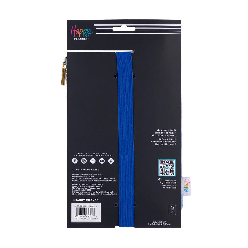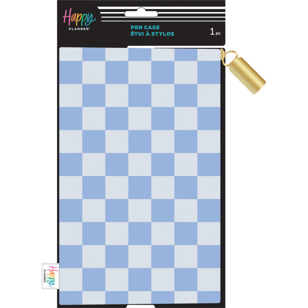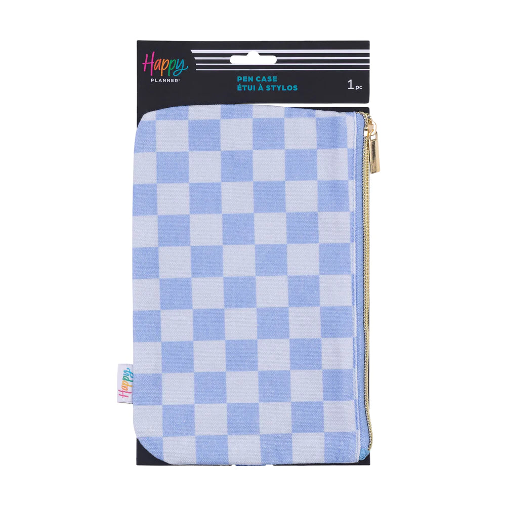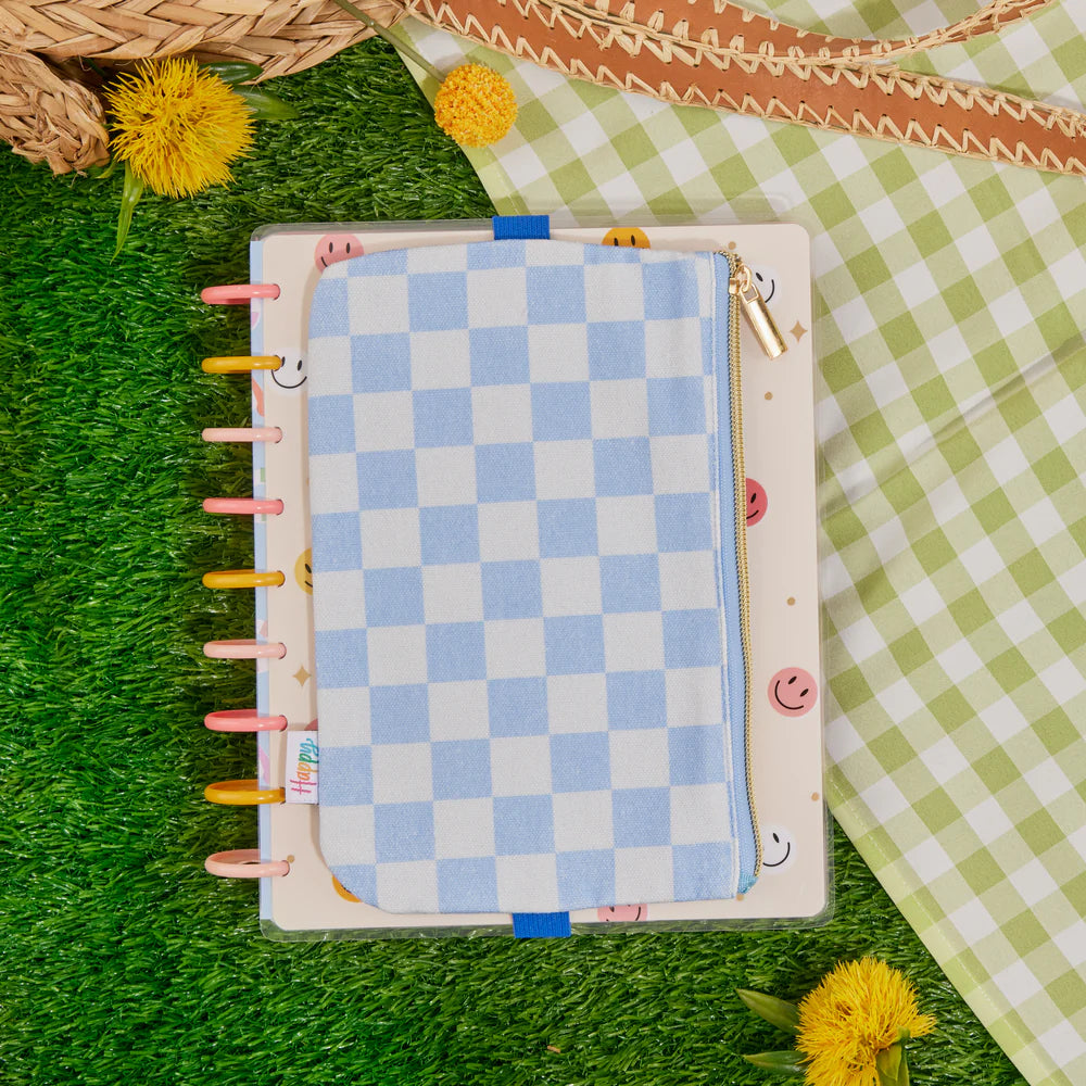 This canvas pen and pencil pouch features a blue checkered pattern. The pouch has a contrasting blue band that wraps around your Happy Planner cover. The zip closure will keep your pens, sticky notes, and washi tape safe!
