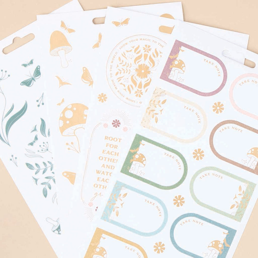 These Woodlands sticker designs include botanical accents, motivational quotes, and woodland critters.