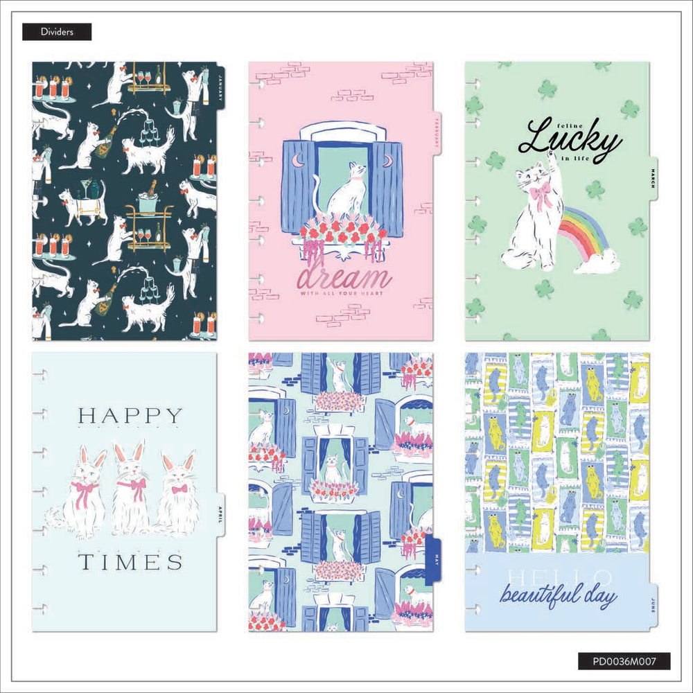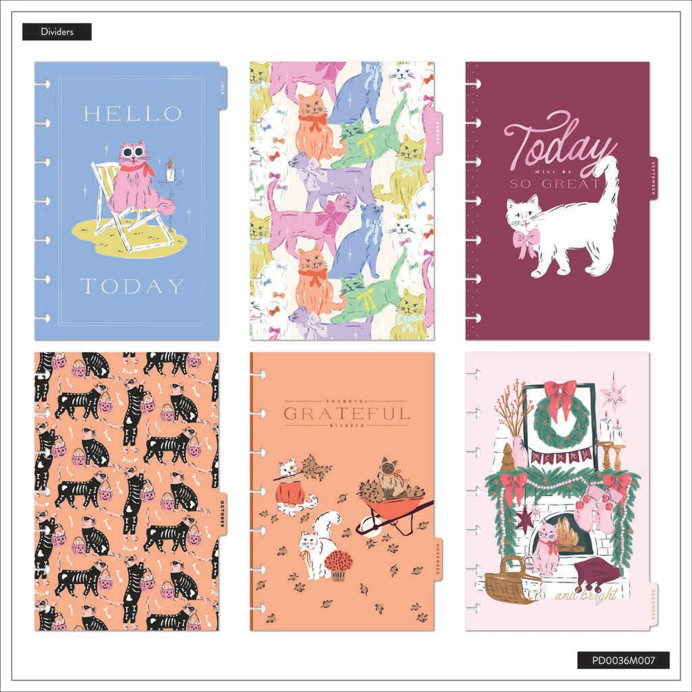 This mini happy planner includes dated monthly calendars and weekly spreads. The 12 dividers detail cute seasonal cat designs by guest artist Krissy Mast.