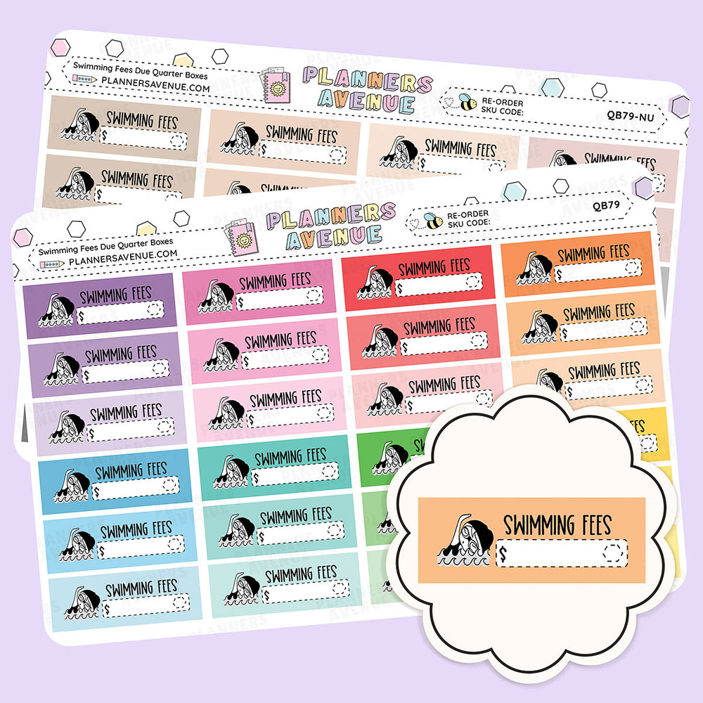 • You will receive 1 (one) sheet of 24 Swimming Quarter Box Stickers.