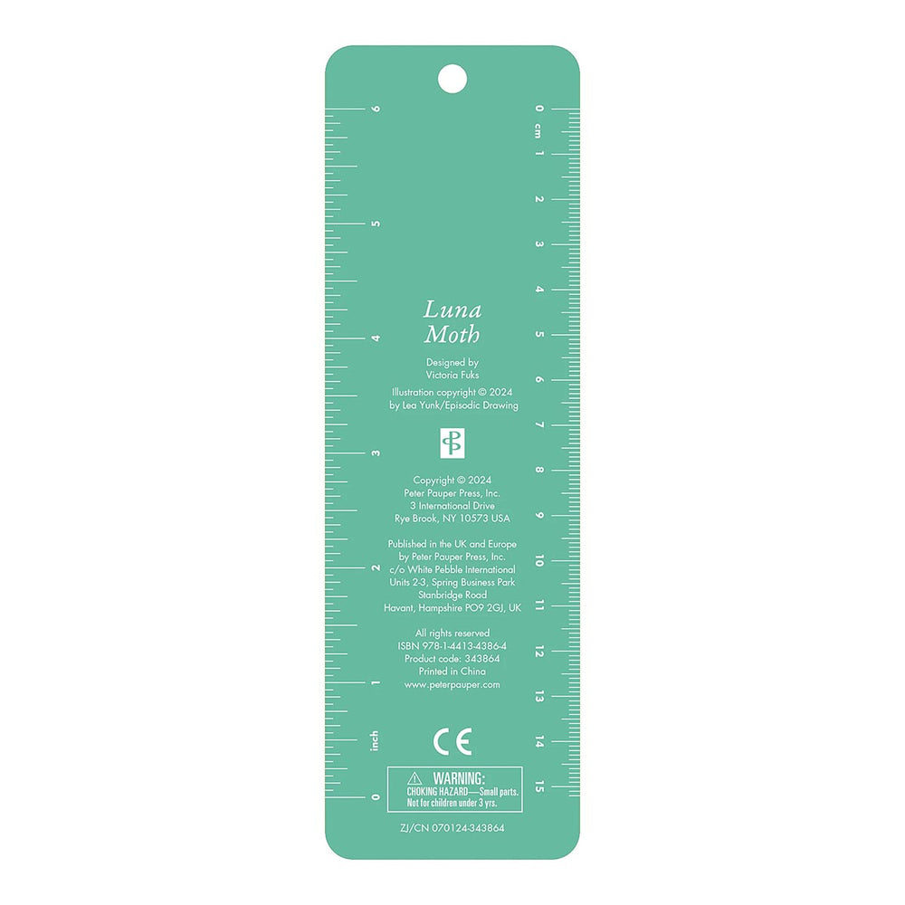 Luna Moth Beaded Bookmark features a delicate moth floral design, a beaded tassel and a ruler on the back.