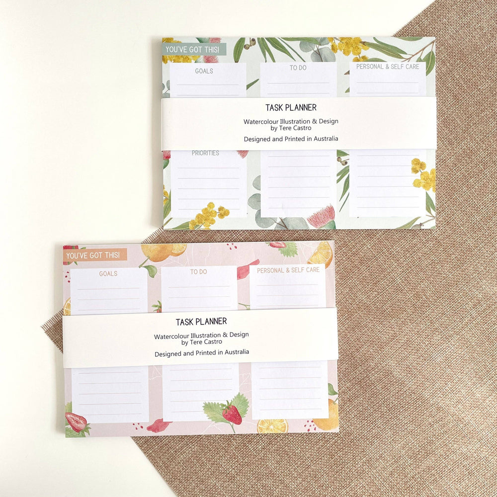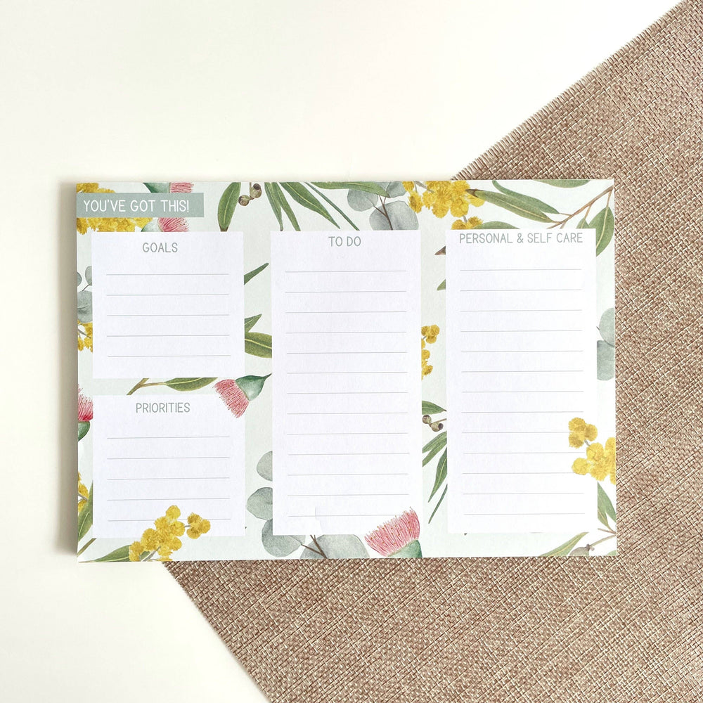 Task Planner A5 Notepad features watercolour art inspired by Australian nature, with a to-do list, goal plans, and priorities for what you need to achieve in your personal life.