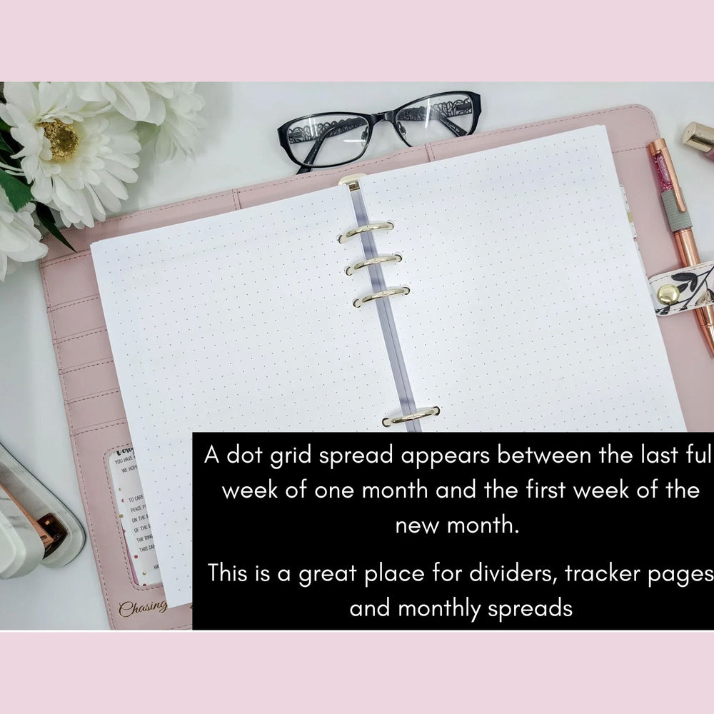 - A dot page spread appears between the last full week of one month and the first week of the next month allowing you to use monthly dividers or simply use them as a note taking space.