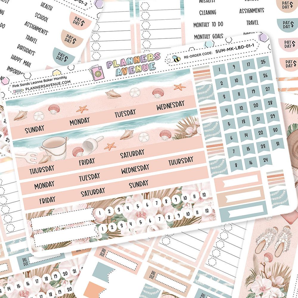 Pink Sands Leanne Baker Monthly Sticker Foiled Kit is perfect for decorating the monthly view in your Leanne Baker Weekly planner or other A5-sized planners.