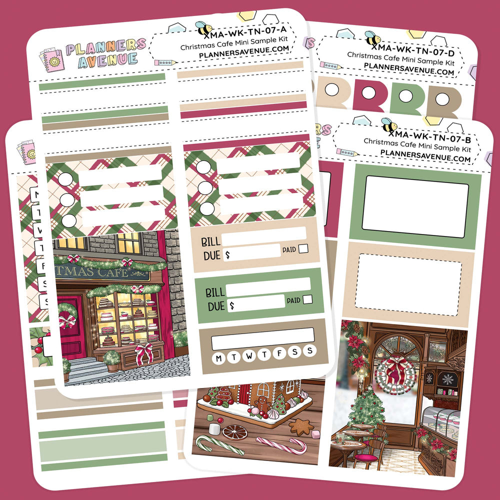 The Christmas Cafe Mini Sampler Weekly Sticker Kit includes four small sticker sheets of planner stickers perfect for functional and decorative weekly planning.
