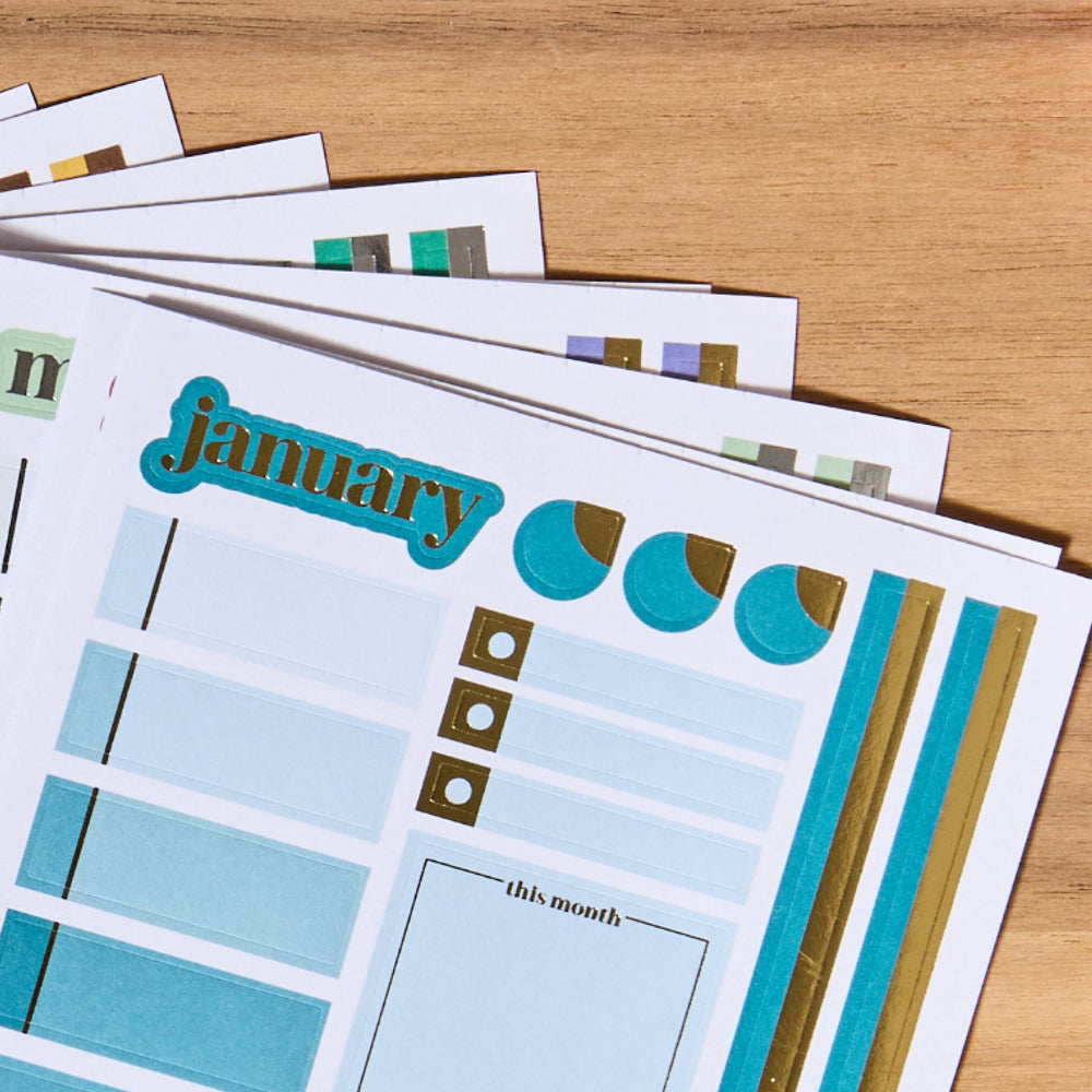 From inspirational sayings to monthly motifs, decorate and celebrate all year long with a page of gorgeous, colourful, and mixed metallic stickers for every month.