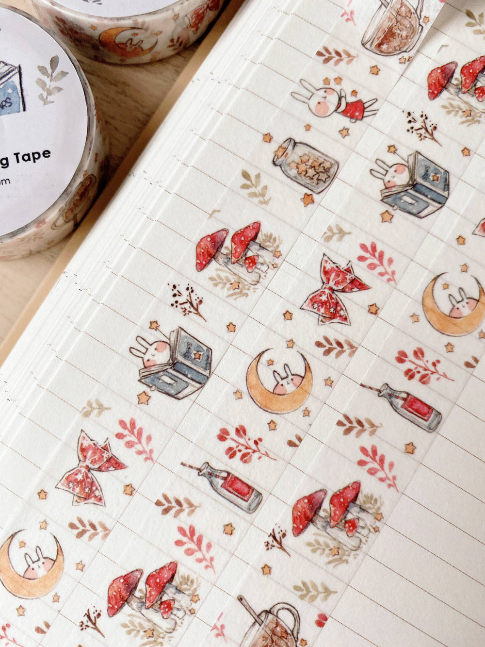 Add a whimsical touch to your planner with the Mushroom & Rabbit Washi Tape. This roll of 15mm washi tape will bring your notes, lists, and bullet journals to life with its cute illustrations of bunnies, books, and mushrooms.