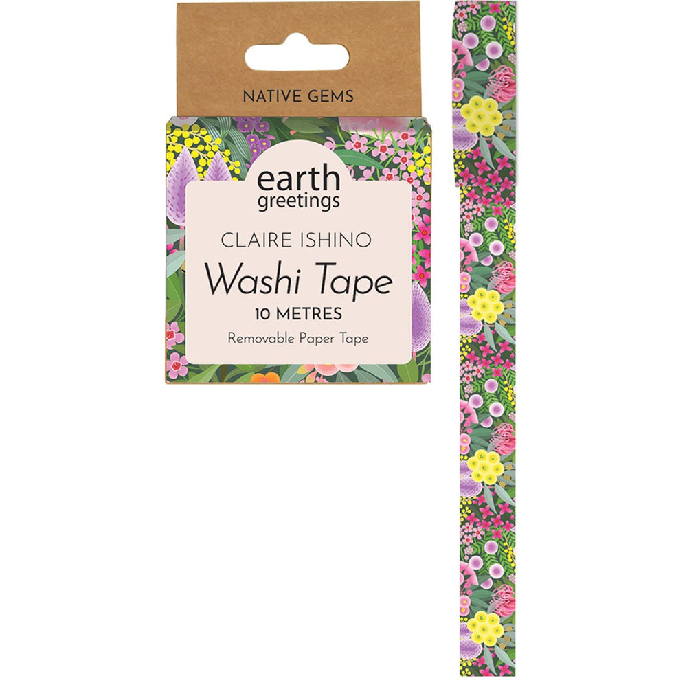 Earth Greetings Native Gems Washi Tape is made from Japanese Washi paper with a 95% recycled paper core. It is a pretty paper tape featuring the botanical art of Australian artist Claire Ishino.