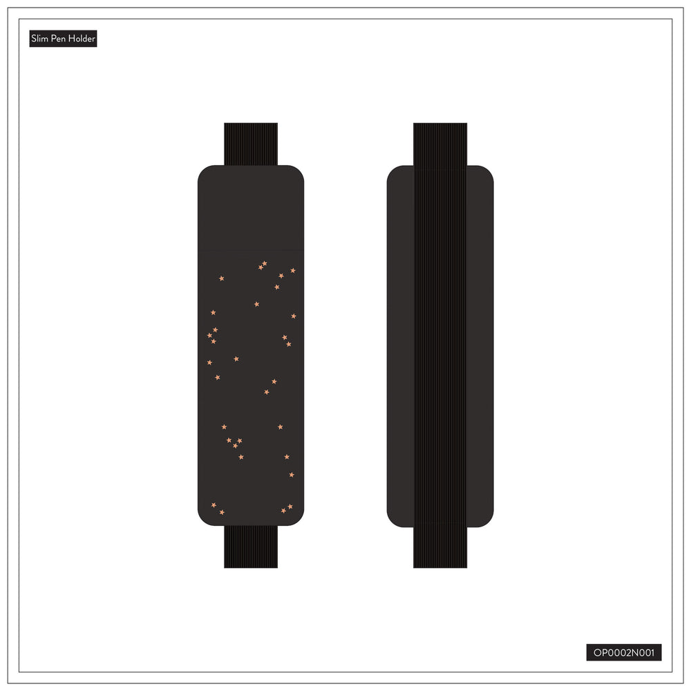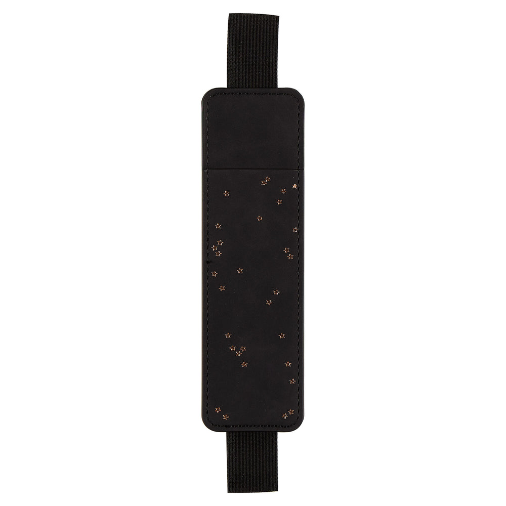 Its slim, soft black vegan leather design with tiny stars slips easily onto your planner or notebook with an elastic band.