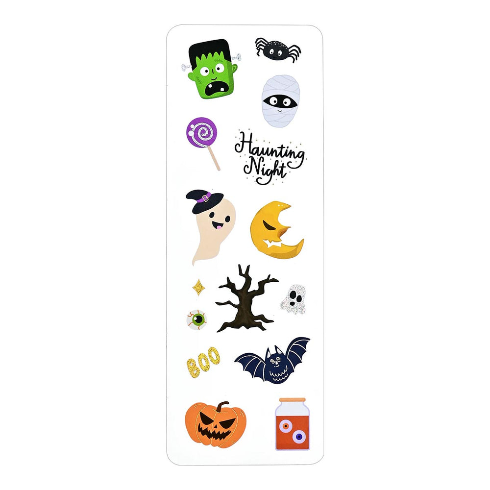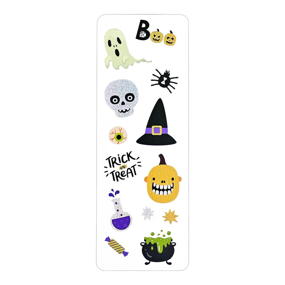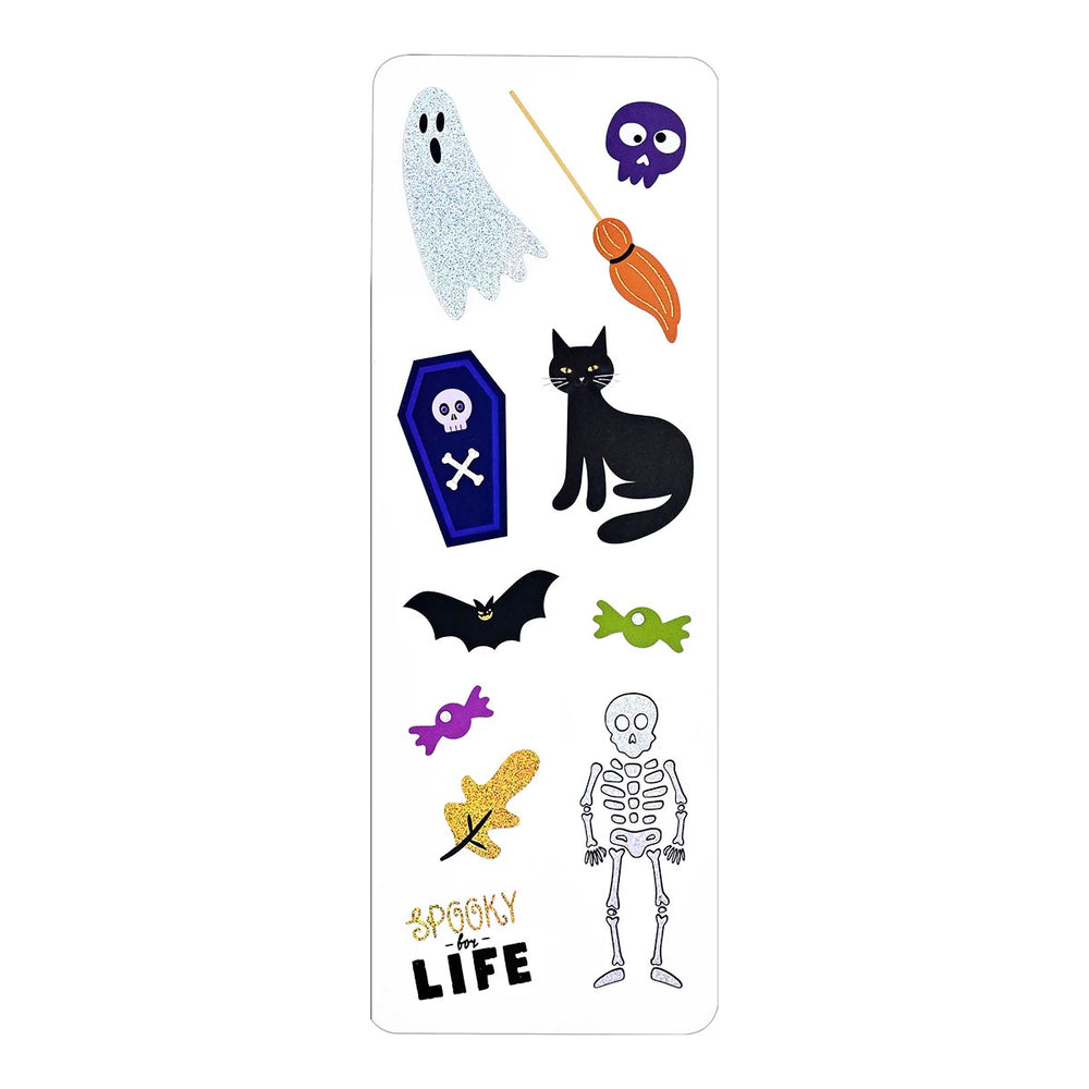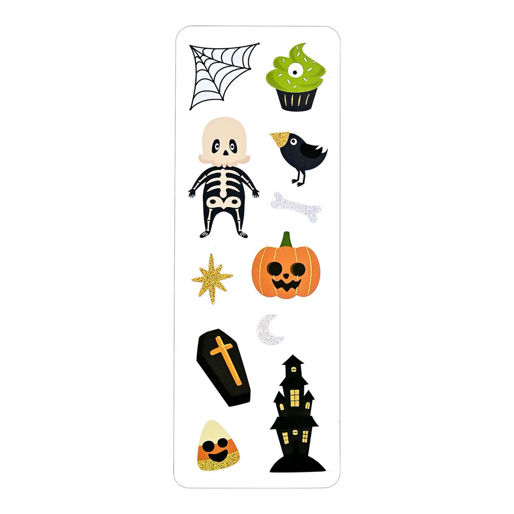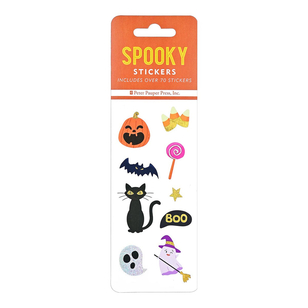 Fun and decorative Spooky Sticker Set featuring Pumpkins, black cats, ghosts, skulls, and phrases.
