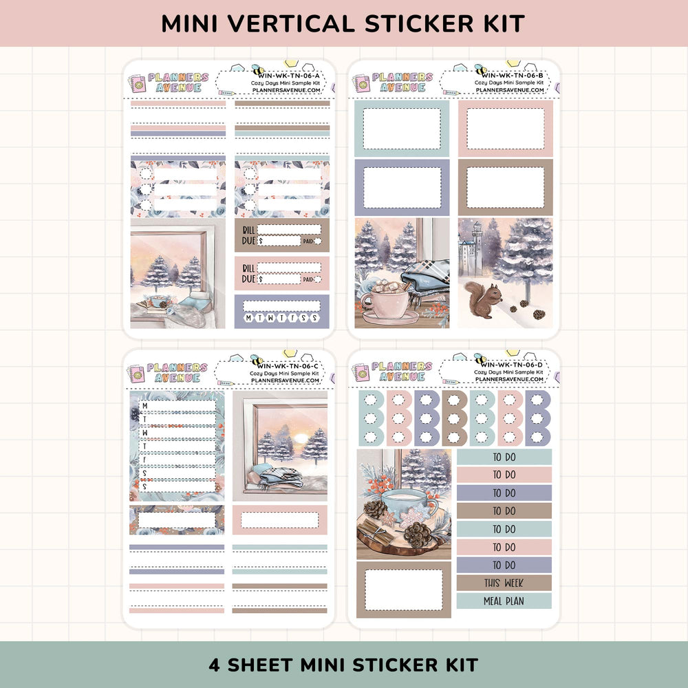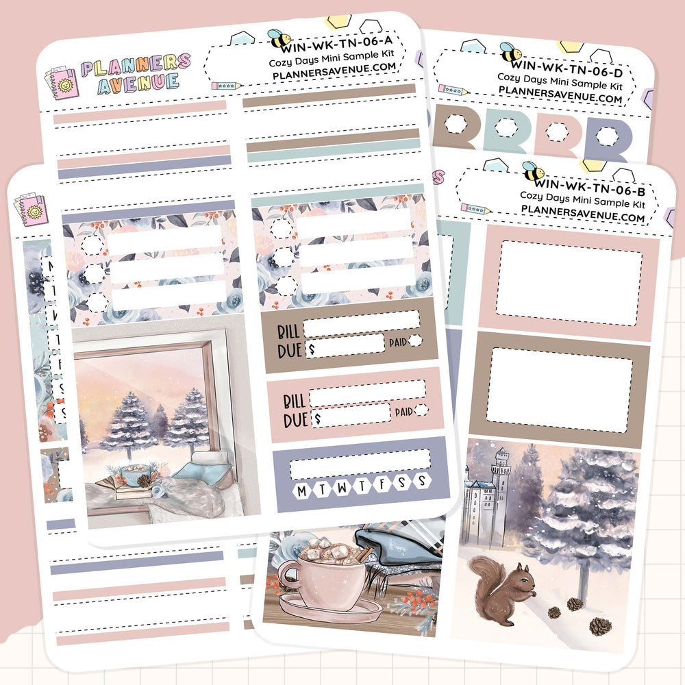 The Cozy Days Mini Sampler Weekly Sticker Foil Kit includes four small sticker sheets of planner stickers perfect for functional and decorative weekly planning.