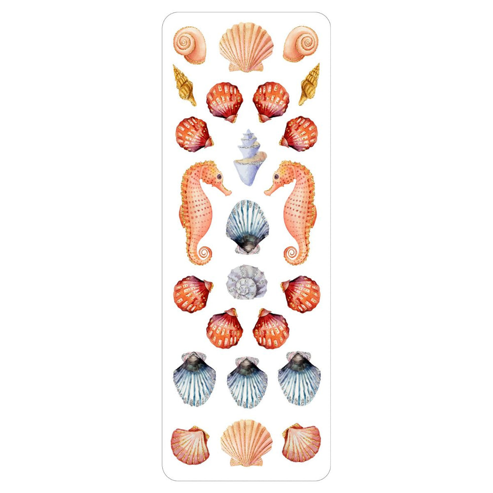 This Seashells Sticker Set features over 100 colourful stickers on 6 sheets, including shells like conches and scallops, plus marine life such as seahorses and starfish. Each sticker shines with holographic foil, adding a bright, seaside touch to your spreads and crafts.
